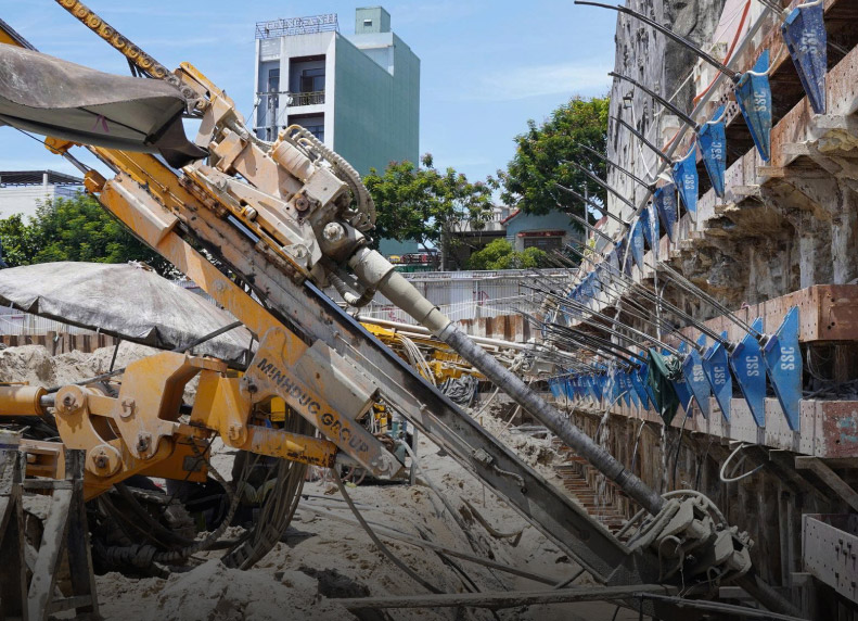 Ông Trần Đại Nghĩa (thứ 4, từ trái sang) - Tổng Giám đốc Tập đoàn Xây dựng Minh Đức cùng các kỹ sư đang trao đổi tại công trường. Ảnh: NVCC
